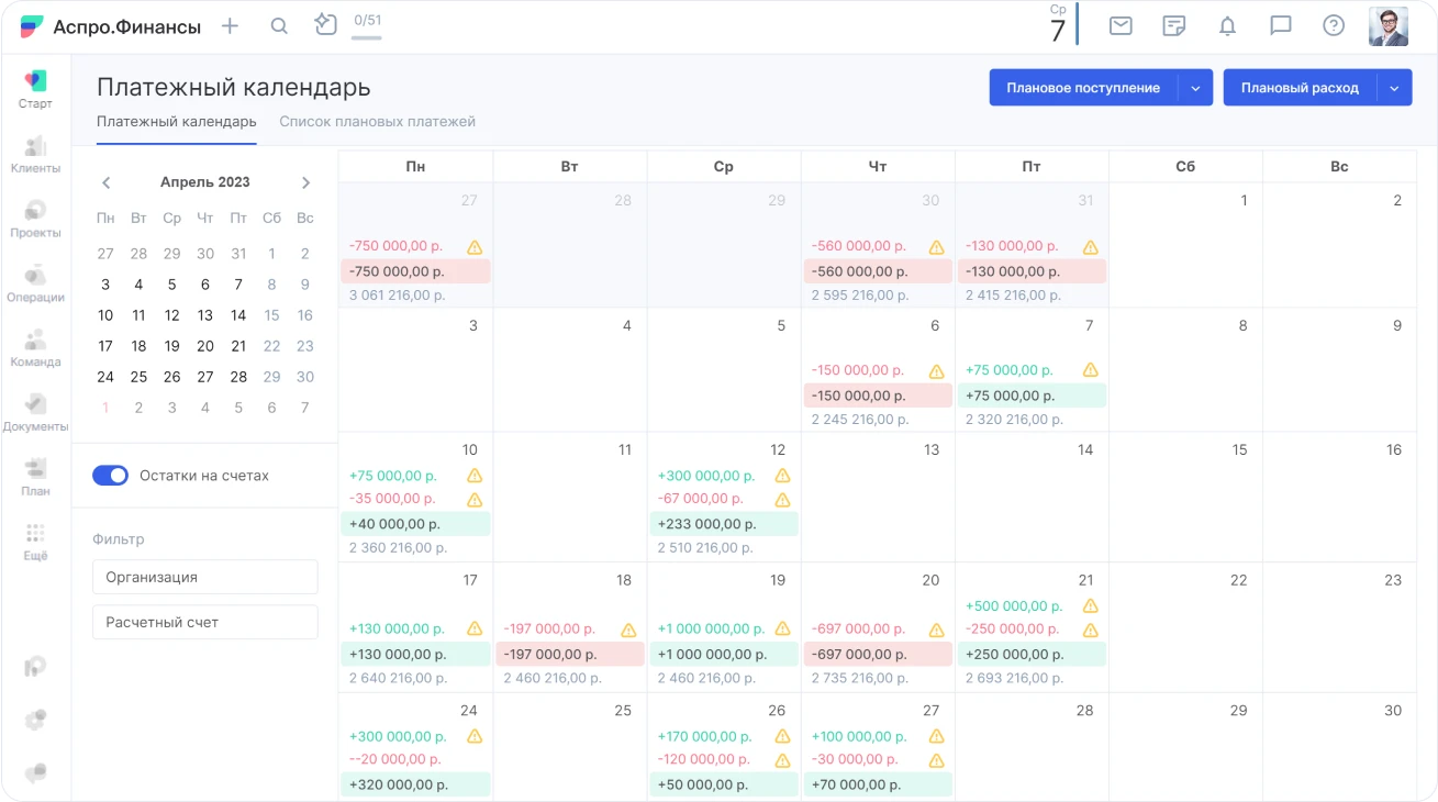 Если вести платежный календарь в сервисе, он автоматически рассчитает остаток на счетах и предупредит о кассовом разрыве.